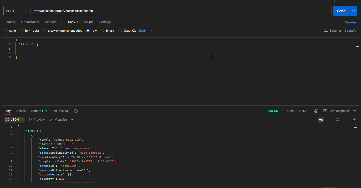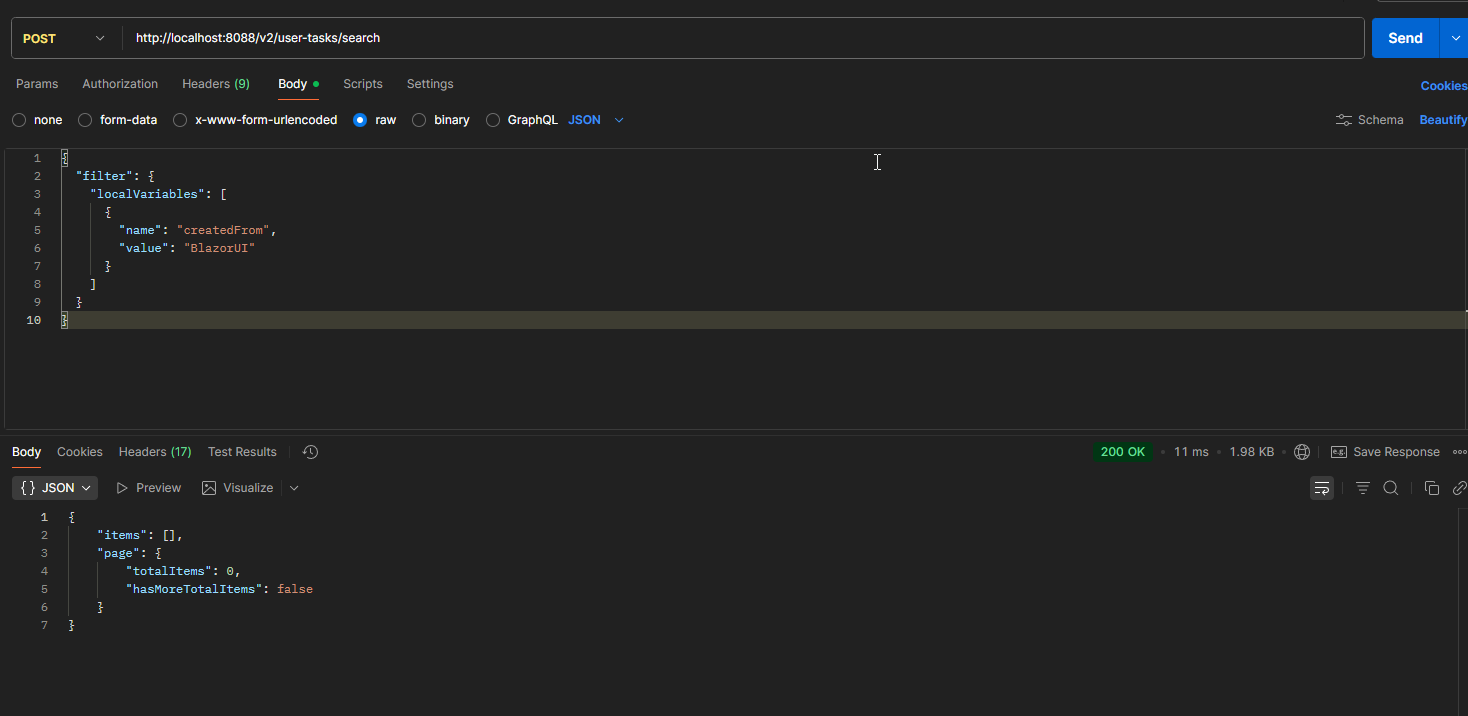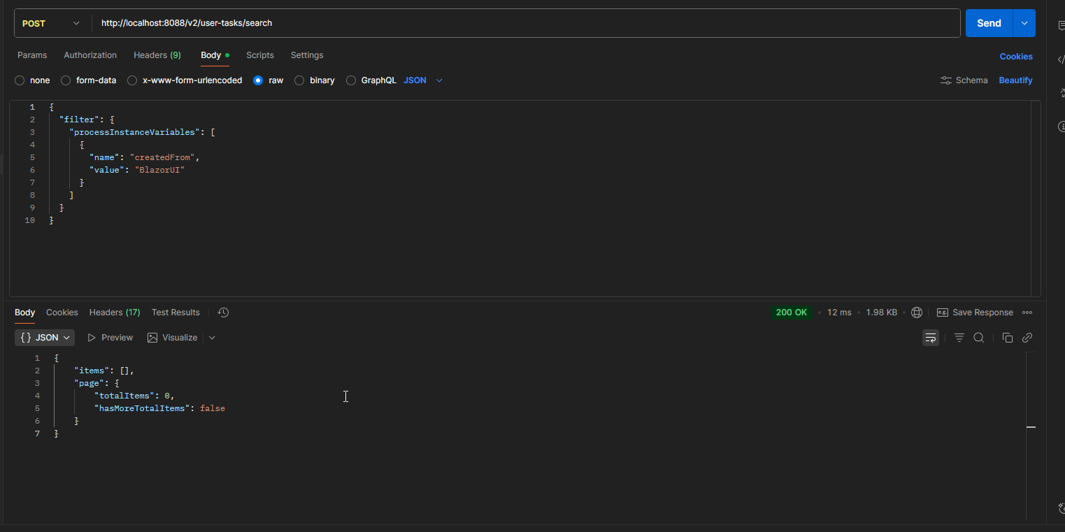 I’m trying to send an HTTP request to find a UserTask, but I’m getting a 400 error from the API. Using this documentation, I see that processInstanceVariables is used for filtering. My UserTask is in a process instance. The instance contains a variable called “createdFrom”: “BlazorUI.” See screenshot:
