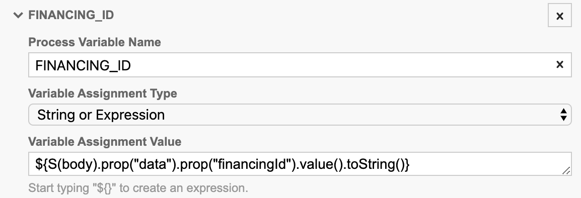 Response code 500 (Internal Server Error): {"type":"ProcessEngineException","message":"Unknown property used in expression: ${S(body).prop(\"data\").prop(\"financingId\").value().toString()}. Cause: Cannot resolve identifier 'body'"}