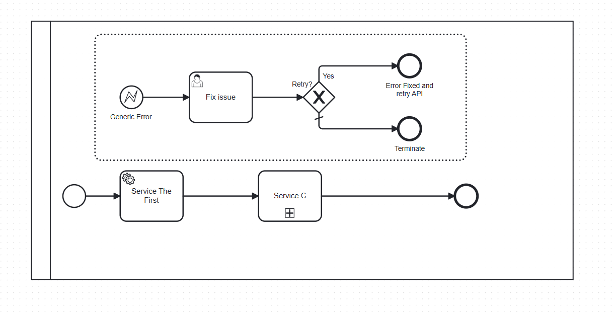 For example, if an API call in Service C subprocess fails, the event subprocess is triggered, and the user form lets them choose Retry.