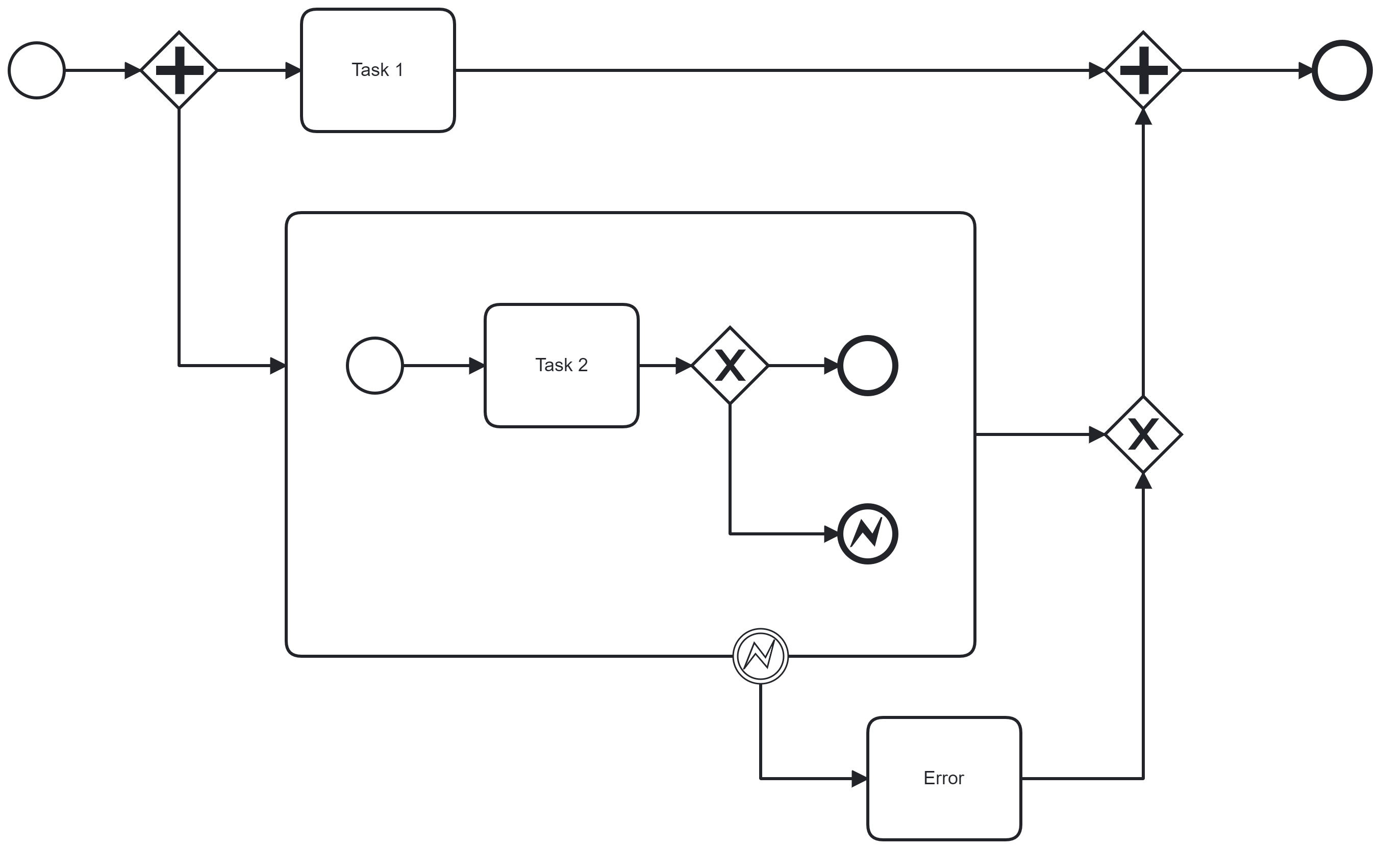 When an error event is caught, the activity on which the boundary event is defined is destroyed, also destroying all current executions therein (e.g., concurrent activities, nested subprocesses, etc.). Process execution continues following the outgoing sequence flow of the boundary event