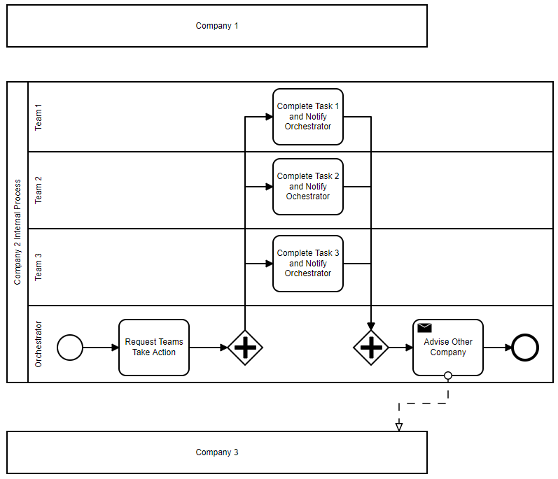 I recently faced a scenario where three companies interact in a process, and I wanted to model each company as its own BPMN pool. Focusing on one of those companies, the departments are modeled as lanes. One particular role in the company is responsible for orchestrating tasks across the different lanes. At one point in the process, this orchestrator must wait for three messages from other lanes before emitting a message itself. The sequence in which the incomming messages arrive is not known in advance. This is where the challenge began.