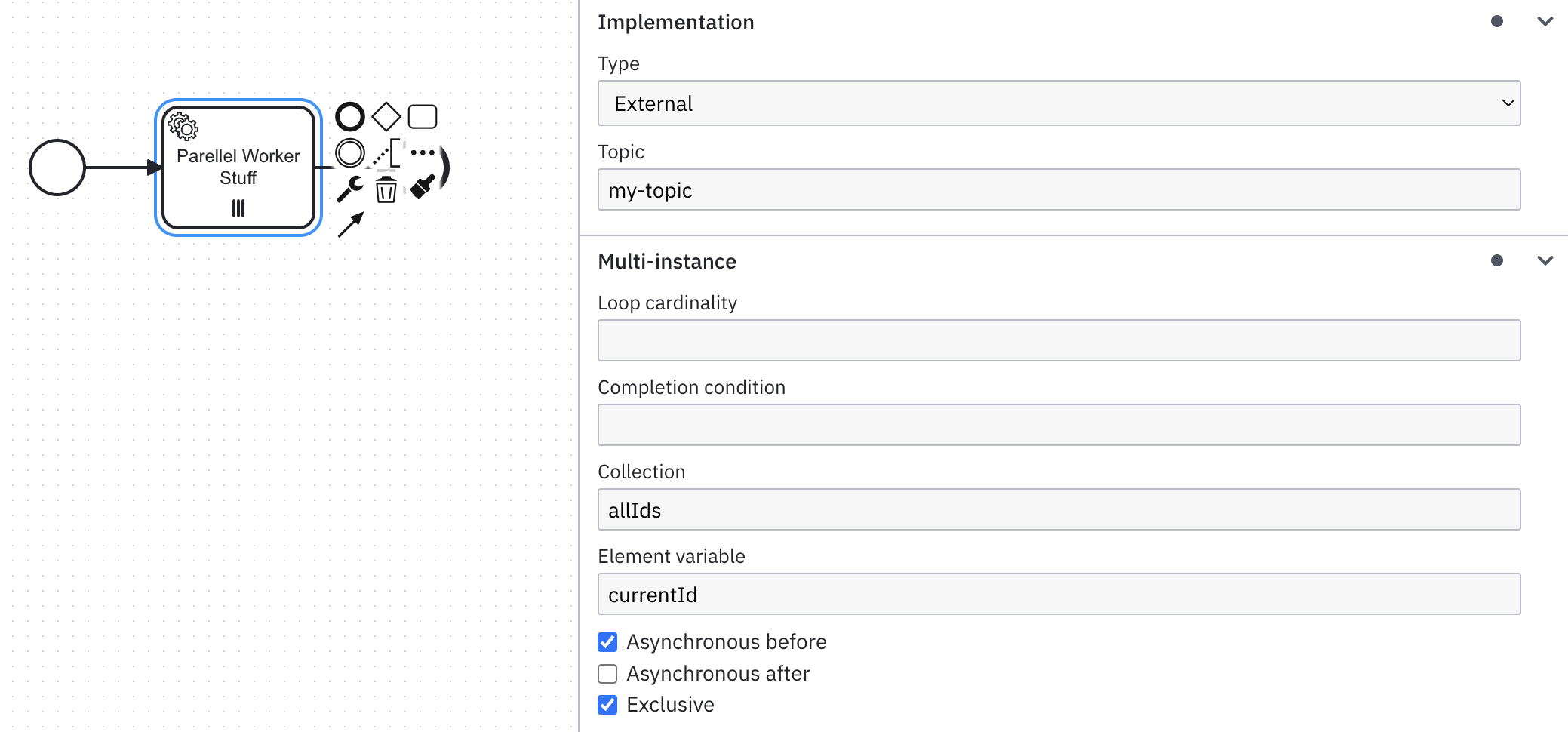 Use Case: In order to prepare a Camunda 8 migration, we moved our camunda 7 operation model to “external”, so we have our engine running on a separate node than our business logic. As long as we used DelegateExpression for the business logic integration (JavaDelegate making a REST call to the backend), we had no problems with a multiinstance service tasks iterating over a collection of ids, looking like this: