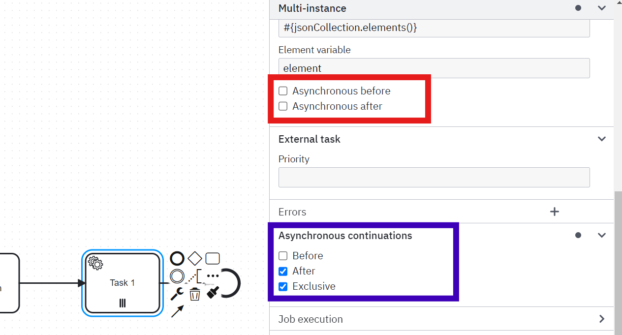 But: The “execution is exclusive for a process instance” only applies to the jobExecutors. for two ids in my collection, the async continuation only runs one job at the time. So far so good. Because of the external task, each of these jobs ends when the external task instance is persisted. But when 2 workers each fetchAndLock one of these tasks and complete, they are not exclusive/synced anymore … so when we are unlucky, one tries to complete and gets an OLE because the other one was slightly faster.