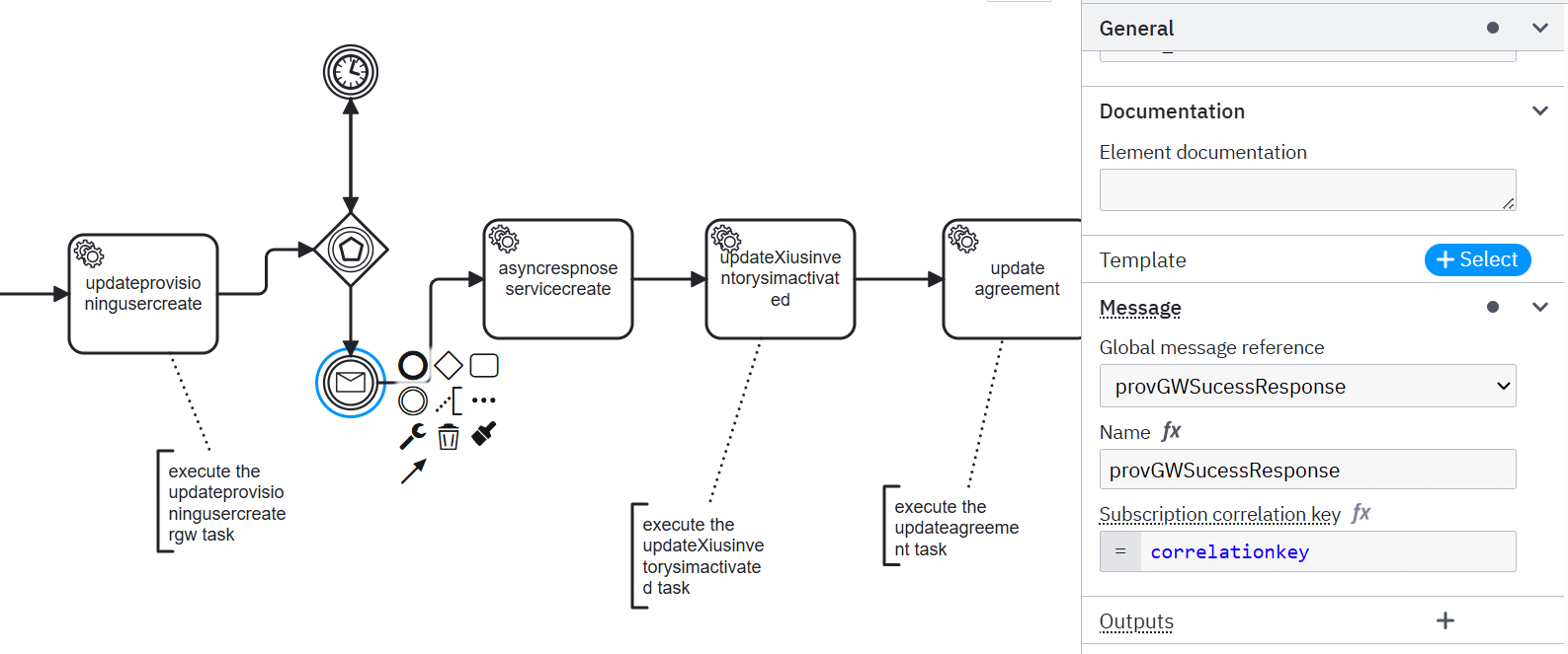 - The relevant BPMN snippet showing the message definition and correlation key