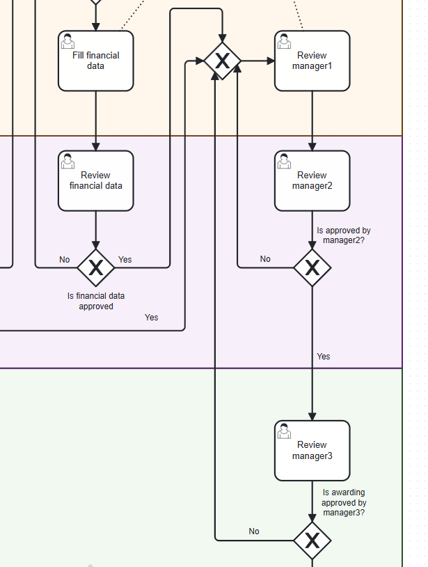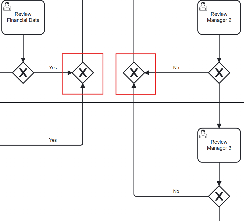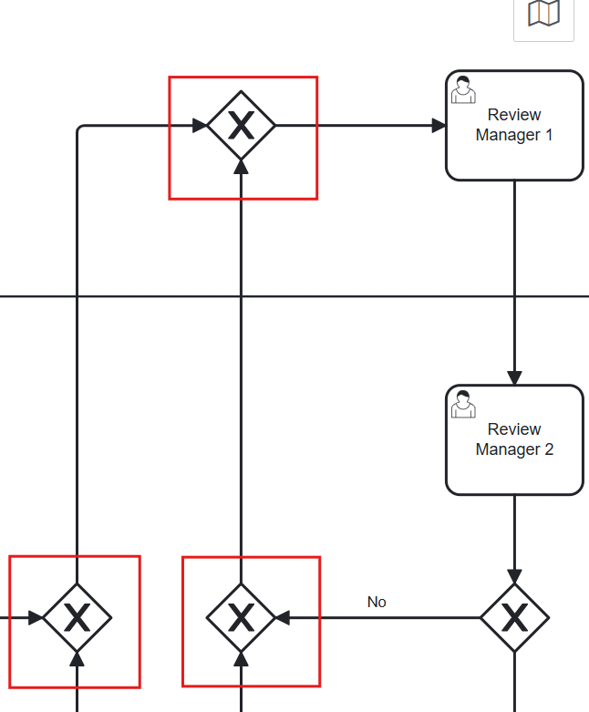 since the review manager1 task can be entered in case of initial review (yes) from 2 paths and in case of reject by managers from 2 paths (no) ?
