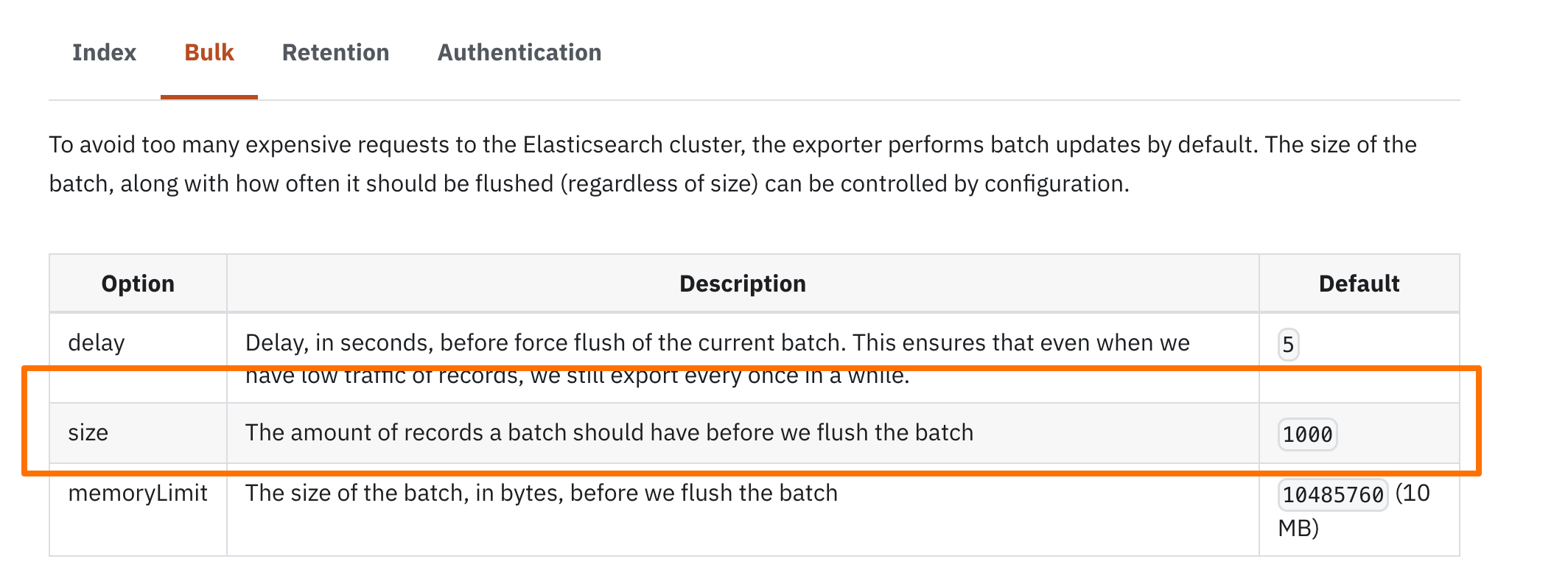 In the Zeebe service configuration in Docker, there’s the setting: ZEEBE_BROKER_EXPORTERS_ELASTICSEARCH_ARGS_BULK_SIZE=1. I’ve seen in the documentation that it has something to do with the number of records a batch must have before releasing it. But I’d like to understand what this actually means in practice. Can anyone explain it better?